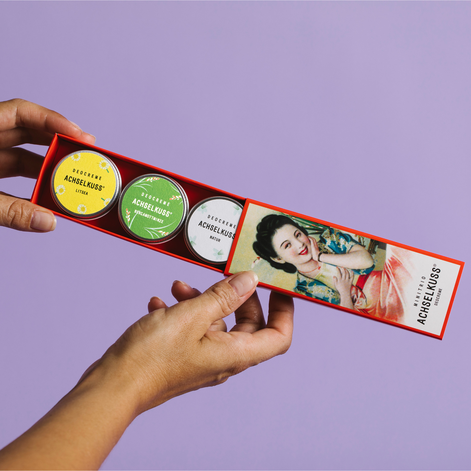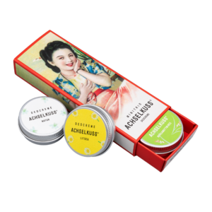 Das neue ACHSELKUSS Set bringt eine frische Brise in dein Badezimmer – zum Probieren, Verlieben oder Verschenken. Natürlich wirksame Frische in drei kleinen Dosen zu je 12g.